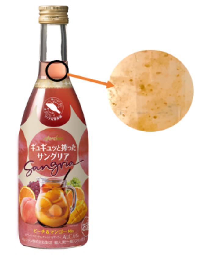 「ギュギュッと搾ったサングリア」は、果汁本来の苦みやピール感が感じられる、みずみずしく香り豊かな混濁の果汁を使用することで、まるで家庭で手作りしたような果実感を実現しています。果実の成分が浮遊、沈殿していますが、これが美味しさのポイント。品質には問題ないものです。