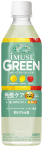 「キリン iMUSE(イミューズ) グリーン」は、キリンの独自素材「プラズマ乳酸菌」を1,000億個配合した「健康な人の免疫機能の維持をサポート」する機能性表示食品です。 グレープフルーツミックス味のすっきりとした甘さで、日常の水分補給やリフレッシュにもぴったりな味わいをお楽しみいただけます(果汁10%未満)。 1日分のビタミン(B1、B6、C)※を配合しているので、日々の体調管理にもおすすめです。