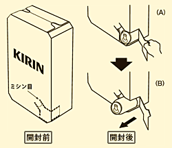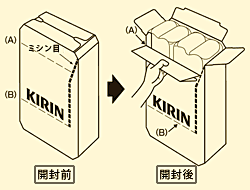 段ボールのミシン目に沿って(A)のように箱を破ります。(B)のように缶が取り出せます。