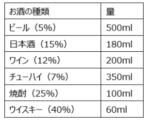 なお、お酒に含まれる純アルコール量の計算式はこちらです。お酒に含まれる純アルコール量(g)=お酒の量(ml)×お酒の度数(%)/100×アルコールの比重(0.8)