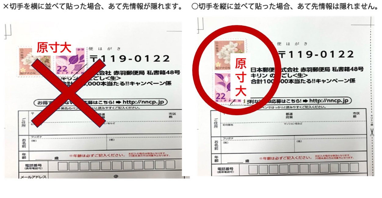 2024年10月1日より切手料金が変更となりました。キャンペーン専用応募台紙(はがき)に切手を貼るときは、あて先の「郵便番号」「住所」が隠れないように切手を貼ってご応募ください。 以下の参考例のように切手をお貼りください。