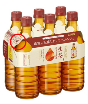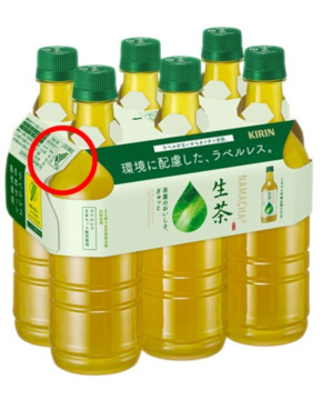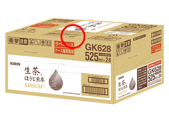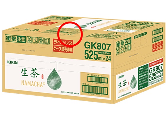 「キリン 生茶」と「キリン 生茶 ほうじ煎茶」のラベルレス商品6本パックには商品を包む紙に、ケースで販売する525mlと2Lペットボトルの商品は箱にベルマークを付けています。
